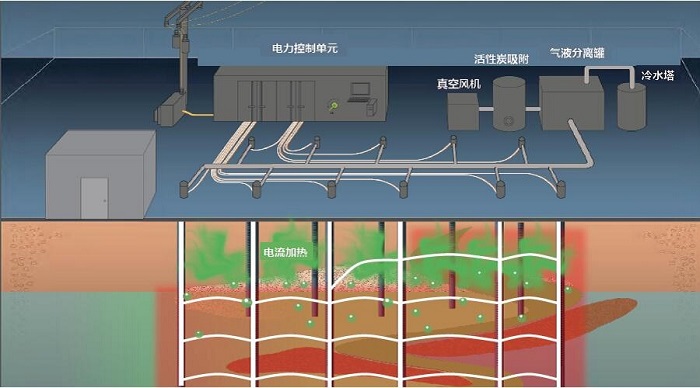技術原理:原位電流加熱熱脫附技術是利用土壤和地下水的天然導電性,通過電流對土壤和地下水加熱,從而加熱土壤和地下水中的污染物,改變污染物的物化性質,使污染物從土壤和地下水中脫附氣化,進而從土壤和地下水中去除。