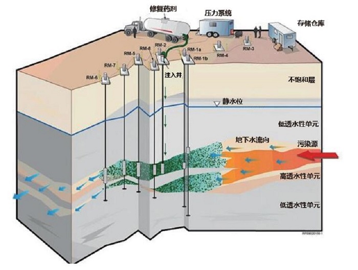 技術原理:使用注入設備將高效藥劑注入地下,通過化學藥劑與污染物之間的物理化學作用,降低污染物質的遷移性,使污染物毒性降低或變成無毒性的一種方法。