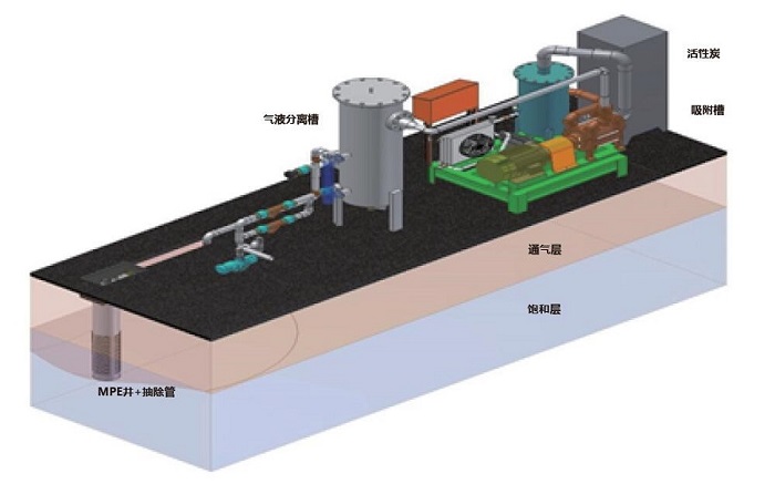 技術原理:通過真空泵抽氣使井內產生高真空度,可同時抽提井內的土壤氣體、地下水以及可能存在的浮油層,并可同時降低包氣帶、毛細管帶及飽水帶內的揮發及半揮發性有機污染物濃度。