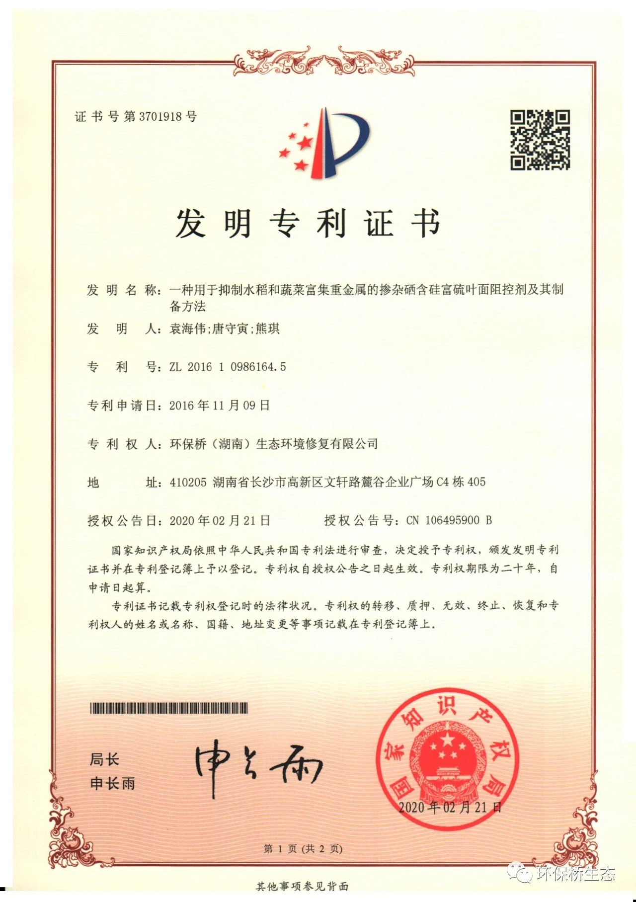“楚戈”葉面阻控劑由環保橋(湖南)生態環境工程股份有限公司研發制造,擁有自主知識產權,獲授權多件國家發明專利,擁有國家級肥料登記證,入選湖南省首購產品目錄。