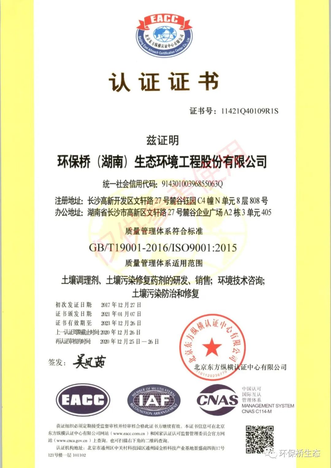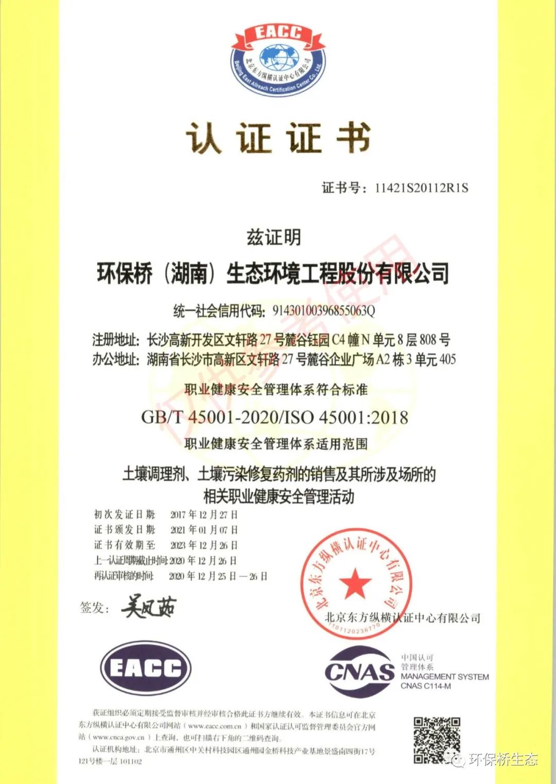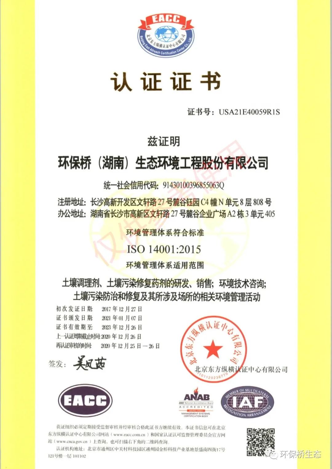 我司2017年初次獲得ISO三大管理體系認證證書,2021年獲得再認證證書。我司獲得的ISO三大管理體系認證適用范圍包括土壤調理劑、土壤污染修復藥劑的研發、銷售;環境技術咨詢;土壤污染防治和修復等。