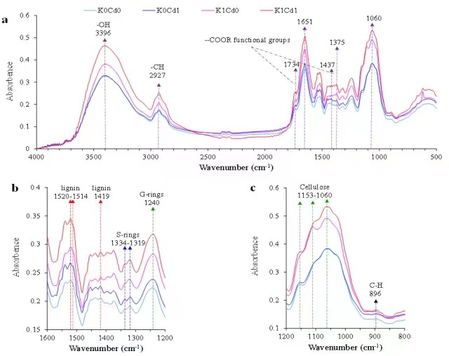 圖2?不同鉀、鎘處理下甘薯根細(xì)胞壁不同組分的傅里葉變換紅外光譜分析