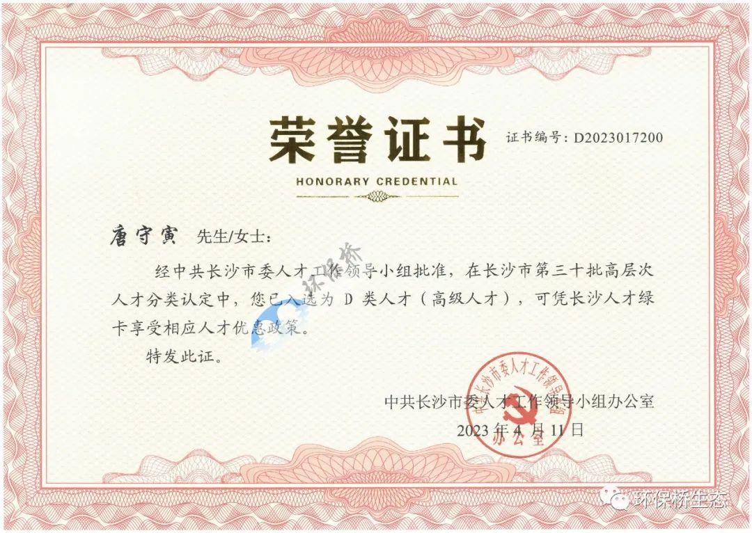 近日,中共長沙市委人才工作領(lǐng)導(dǎo)小組印發(fā)《關(guān)于公布<長沙市第三十批高層次人才分類認(rèn)定名單>的通知》(長人才辦發(fā)〔2023〕2號),環(huán)保橋副總經(jīng)理唐守寅榜上有名,入選“長沙市高層次人才”,并獲頒“長沙人才綠卡”。