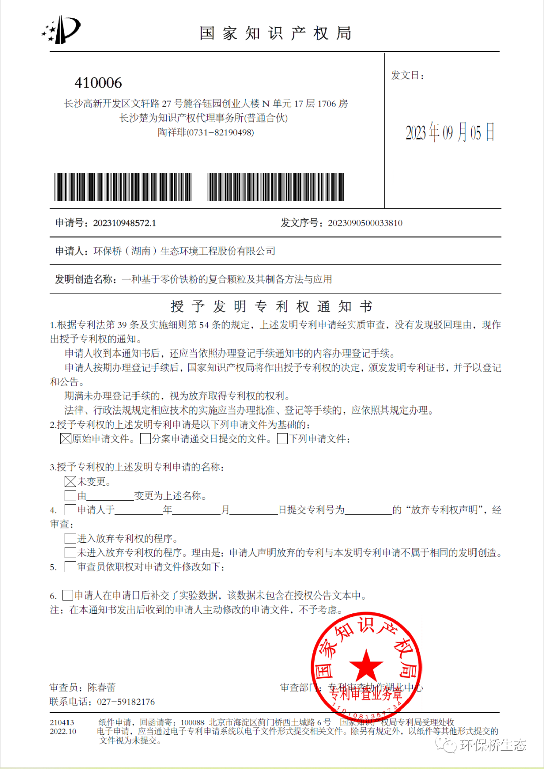 9月5日,環保橋(湖南)生態環境工程股份有限公司收到國家知識產權局發來的《授予發明專利權通知書》,我司申請的發明專利“一種基于零價鐵粉的復合顆粒及其制備方法與應用”獲得授權。這是環保橋獲授權的第10件發明專利!