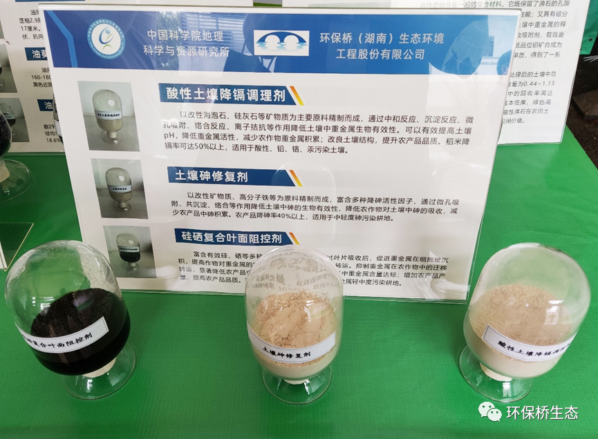 技術成果展覽現場,環保橋(湖南)生態環境工程股份有限公司與中國科學院地理科學與資源研究所聯合研制的酸性土壤降鎘調理劑、土壤砷修復劑、硅硒復合葉面阻控劑等三款產品在“重金屬污染農田低成本長效治理技術及應用”專區展出,得到了眾多嘉賓的關注。據悉,上述產品已在全國10多個省份獲得廣泛應用,推廣面積超過100萬畝。