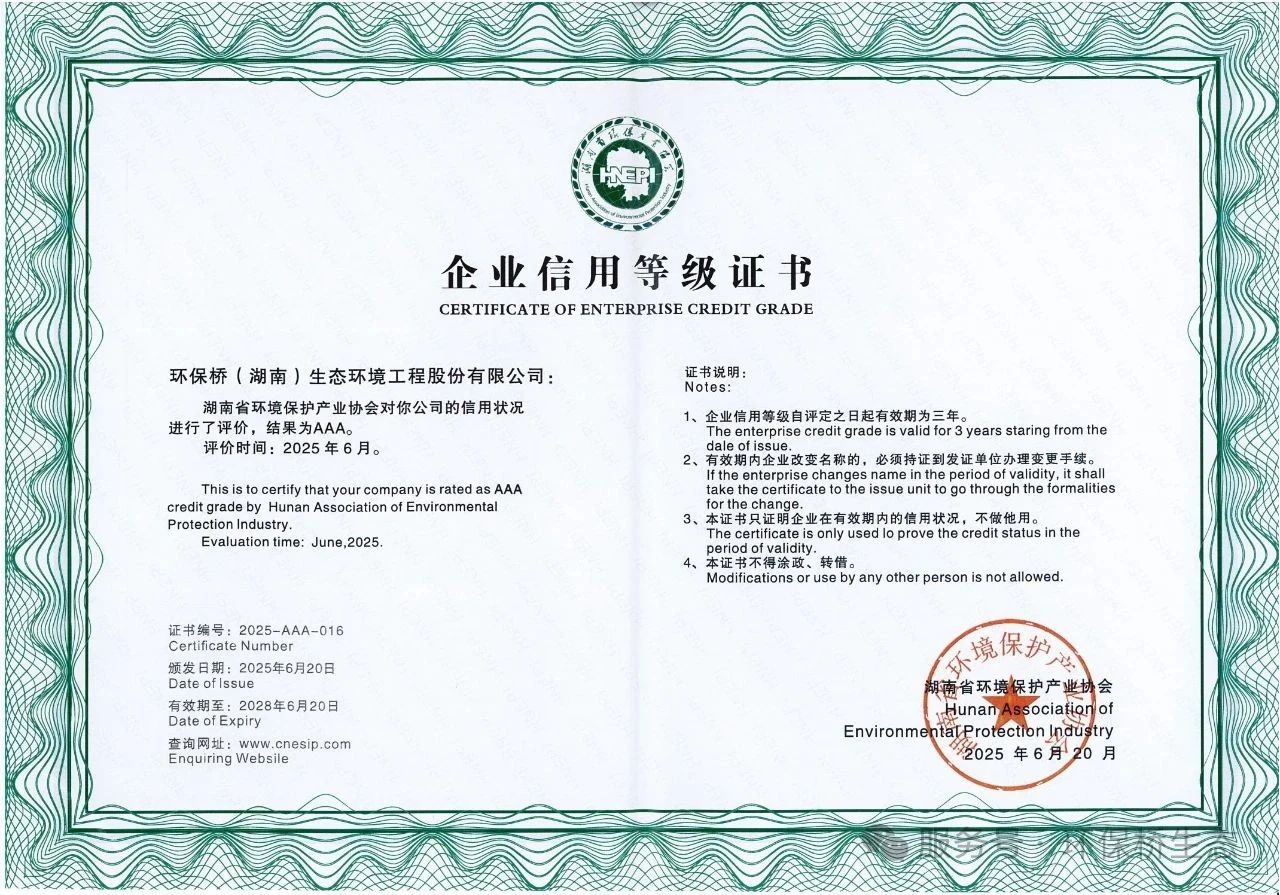 本次獲評“湖南省環(huán)境保護企業(yè)信用AAA級”,體現(xiàn)了社會和行業(yè)對環(huán)保橋生態(tài)公司誠信經(jīng)營、信用管理的高度認可,不僅是公司信用形象的重要標志,也是公司提升品牌價值與競爭力的一項重要無形資產(chǎn)。