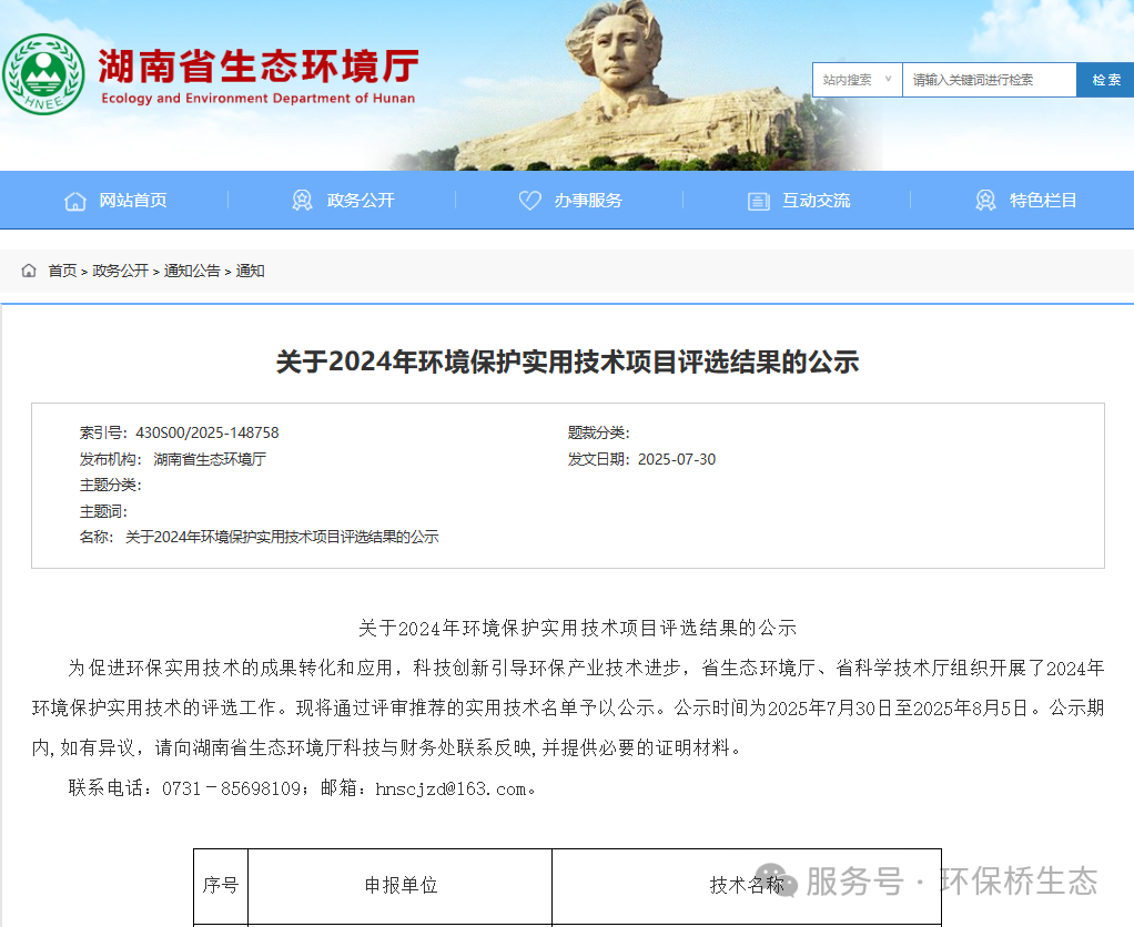 近日,湖南省生態環境廳公布了2024年湖南省環境保護實用技術名錄,全省共28項技術入選。為促進環保實用技術的成果轉化和應用,推動科技創新引導環保產業技術進步,湖南省生態環境廳、湖南省科學技術廳負責組織開展每年的《湖南省環境保護實用技術名錄》評選工作。