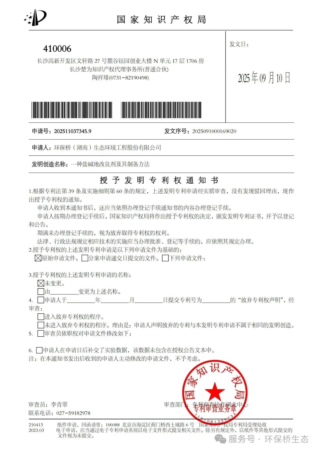 2025年9月10日,環(huán)保橋(湖南)生態(tài)環(huán)境工程股份有限公司收到國(guó)家知識(shí)產(chǎn)權(quán)局發(fā)來的《授予發(fā)明專利權(quán)通知書》,我司申請(qǐng)的發(fā)明專利“一種鹽堿地改良劑及其制備方法”獲得授權(quán)。這是環(huán)保橋獲授權(quán)的第19件發(fā)明專利!同時(shí)是2025年獲授權(quán)的第5件發(fā)明專利!