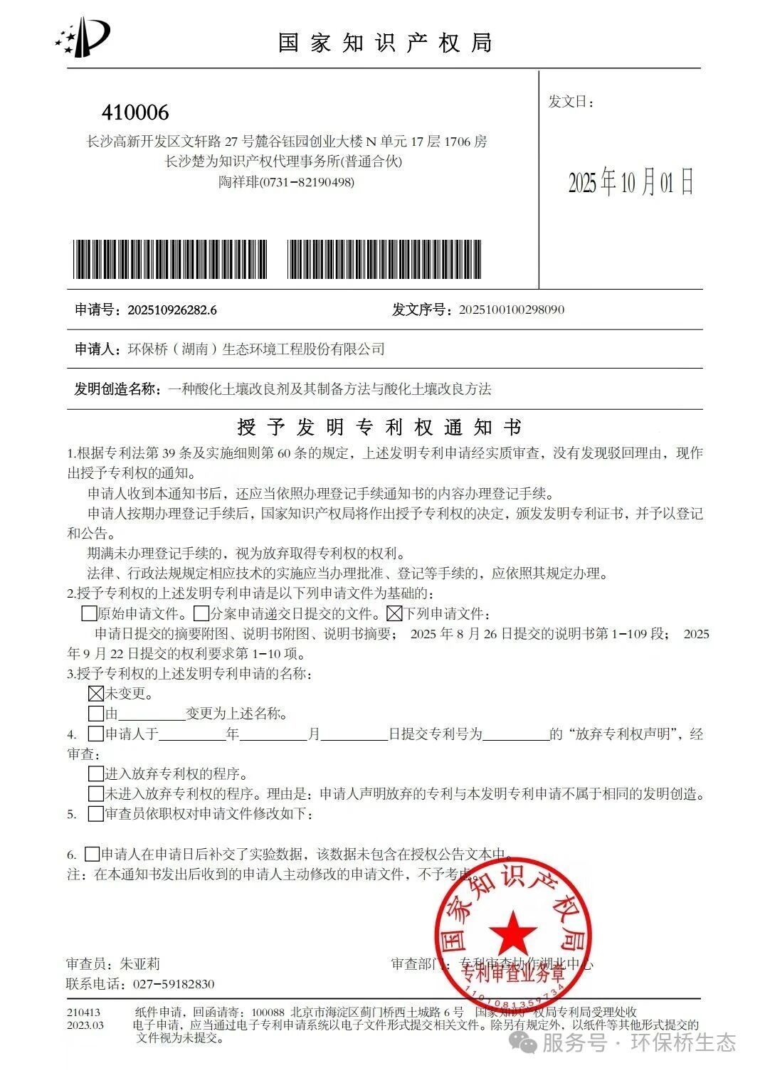 金秋十月,環保橋(湖南)生態環境工程股份有限公司收到國家知識產權局發來的《授予發明專利權通知書》,我司申請的發明專利“一種酸化土壤改良劑及其制備方法與酸化土壤改良方法”獲得授權!