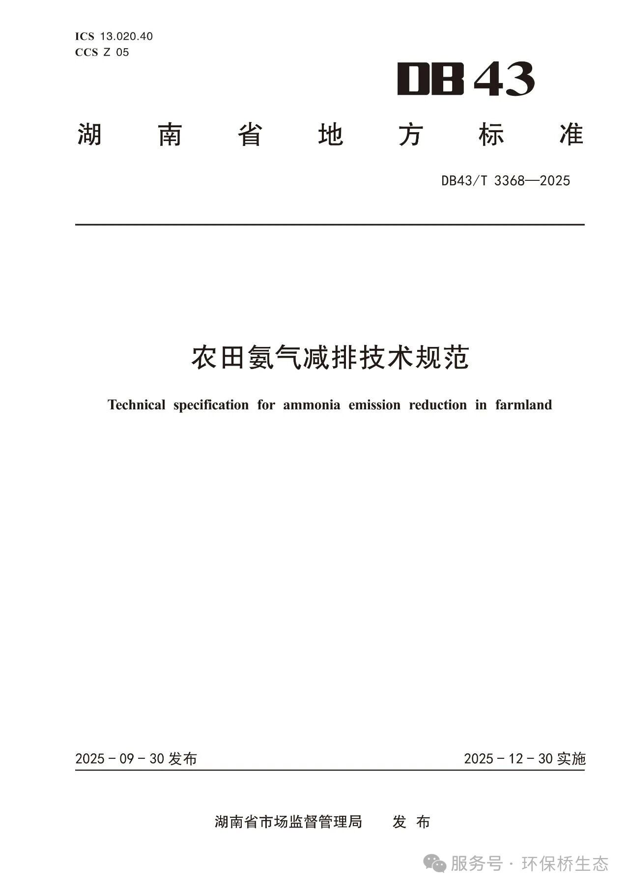 近日,湖南省市場監督管理局發布了湖南省地方標準《農田氨氣減排技術規范》(DB43/T 3368—2025),自2025年12月30日起施行。
